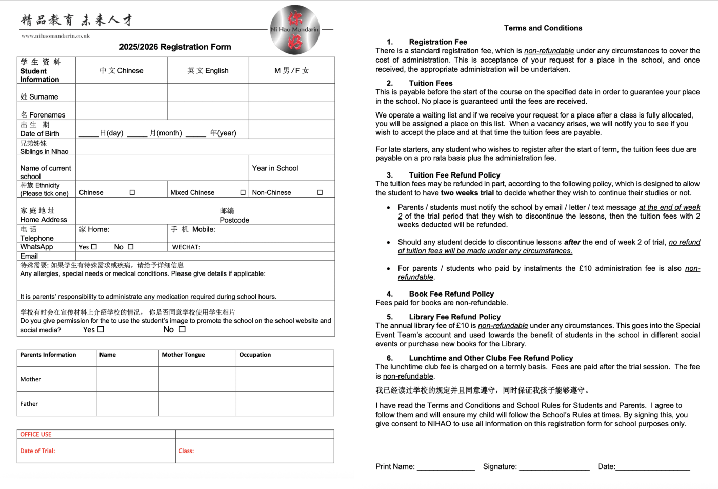 The information includes the student's full name in English and Chinese, date of birth, Chinese language and learning background, name of the primary contact person, and relationship, contact information;